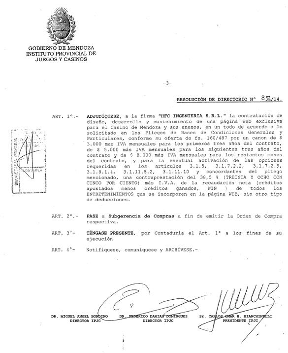 La resolución 851 fue firmada el 24 de setiembre por Carlos Bianchinelli y Federico Domínguez, dos de los tres directores del IPJC. Esta pieza adjudicó a una empresa llamada HFC Ingeniería SRL el “diseño, desarrollo y mantenimiento de una página web para el Casino de Mendoza y sus anexos”, servicio por el cual se pagarán 3.000 pesos más IVA por mes en los primeros tres años, 5.000 pesos más IVA en la etapa intermedia y una suma de 8.000 pesos más IVA por mes en la última etapa de la concesión.