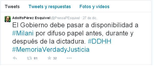 "El Gobierno debe pasar a disponibilidad a #Milani por difuso papel antes, durante y después de la dictadura", pidió el premio Nobel de la Paz argentino, Adolfo Pérez Esquivel, a través de su cuenta en Twitter.