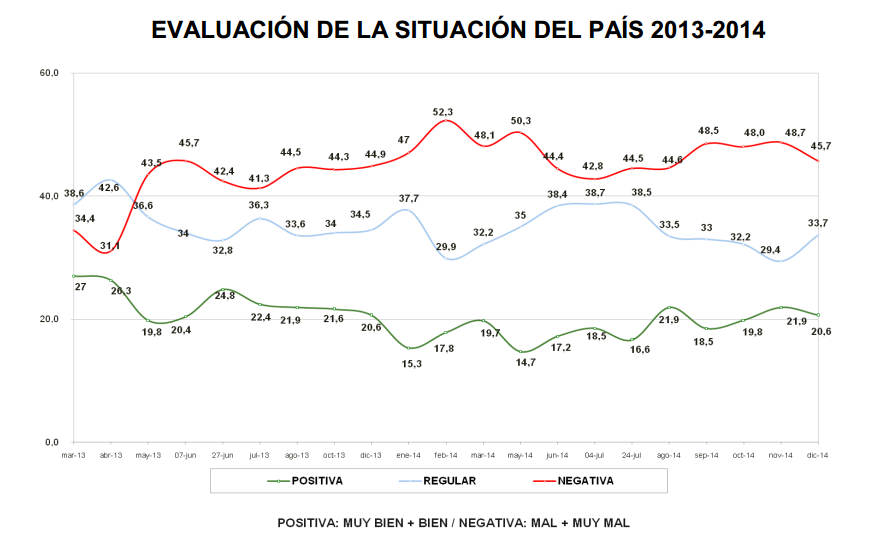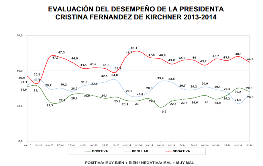 Algunos números muestran un meandroso camino del electorado. Por ejemplo, hoy en día, diciembre de 2014, cayó la imagen negativa de la Presidenta y subió la regular, esa posición en la que todavía los ciudadanos le dan una chance.