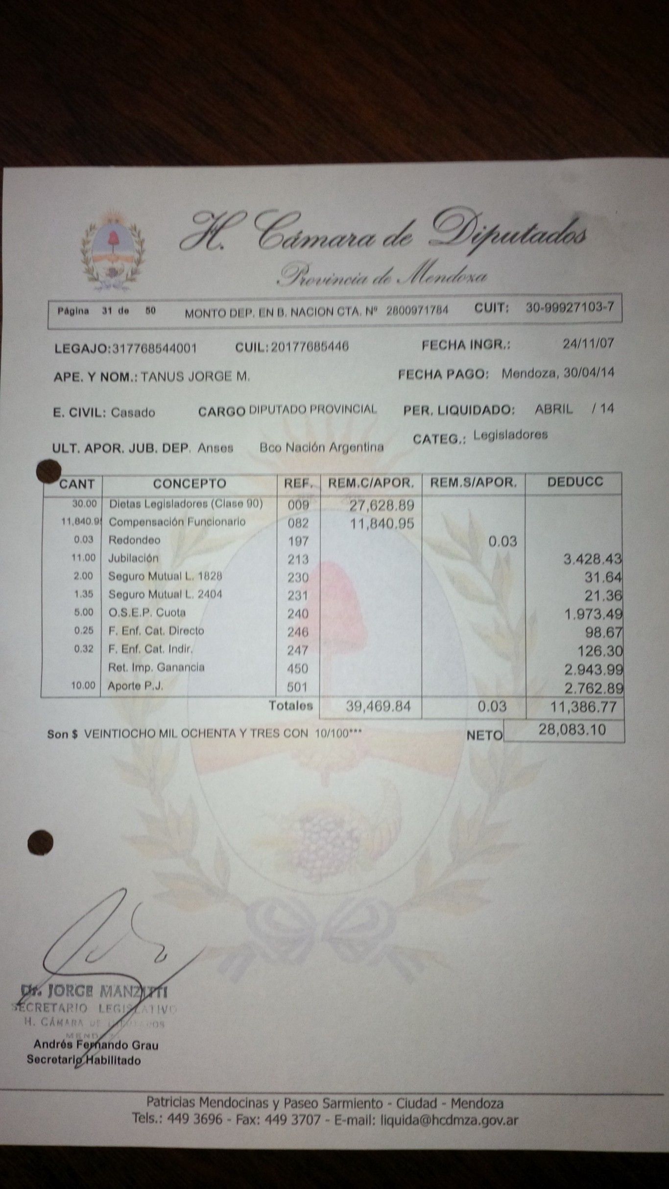 Vaya como muestra del desequilibrio que se ha generado lo que recibe de bolsillo el presidente de la Cámara de Diputados de la provincia, un sueldo muy cercano al del gobernador: Jorge Tanús cobra 28 mil pesos por mes.