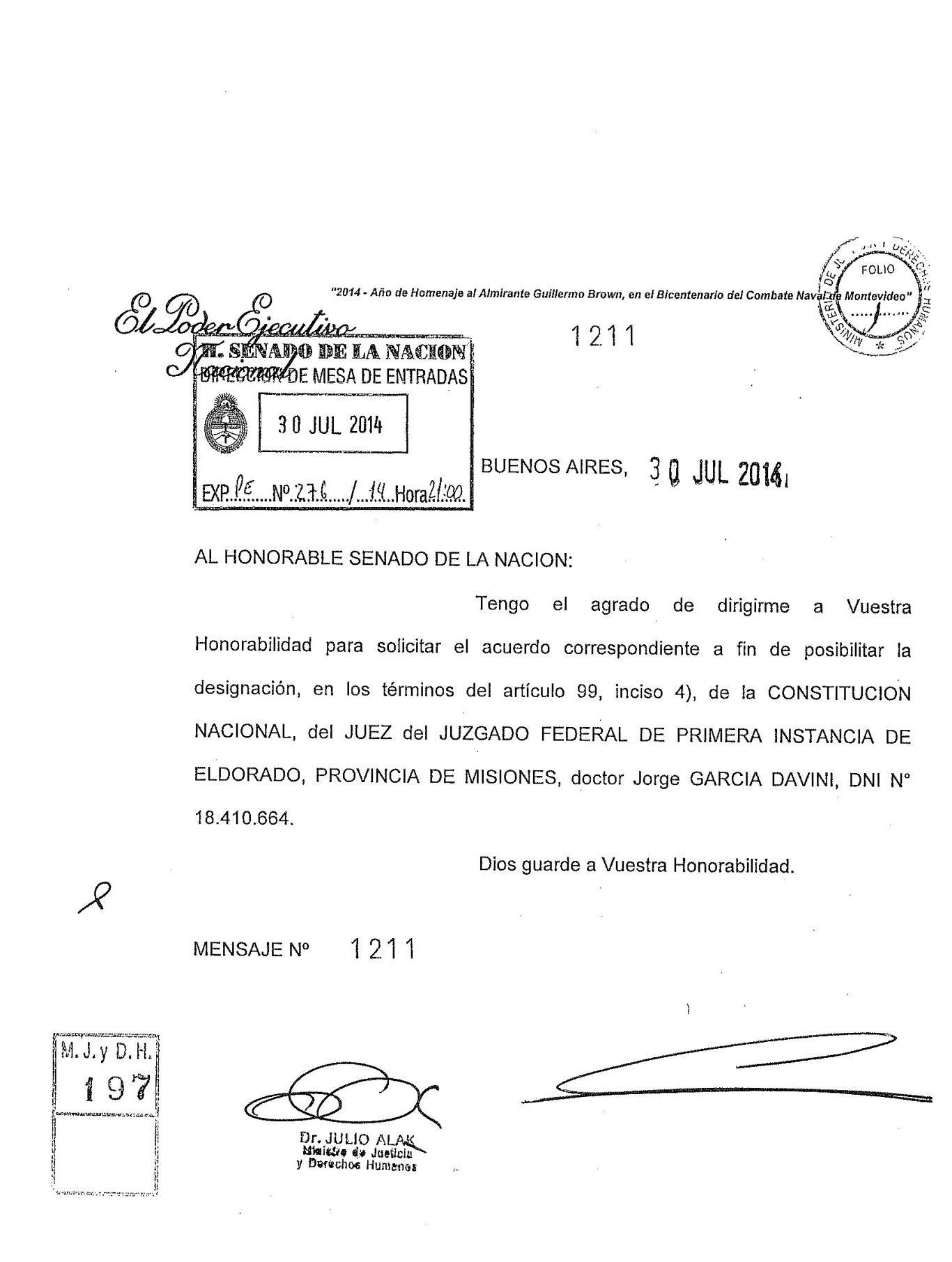 La ONG Ciudadanos Libres, que encabeza el abogado José Mangiocalda, denunció que el Poder Ejecutivo propuso para que el Senado le preste acuerdo como juez de El dorado, provincia de Misiones, al secretario Jorge García Davini, quien resultó en cuarto lugar en el concurso.