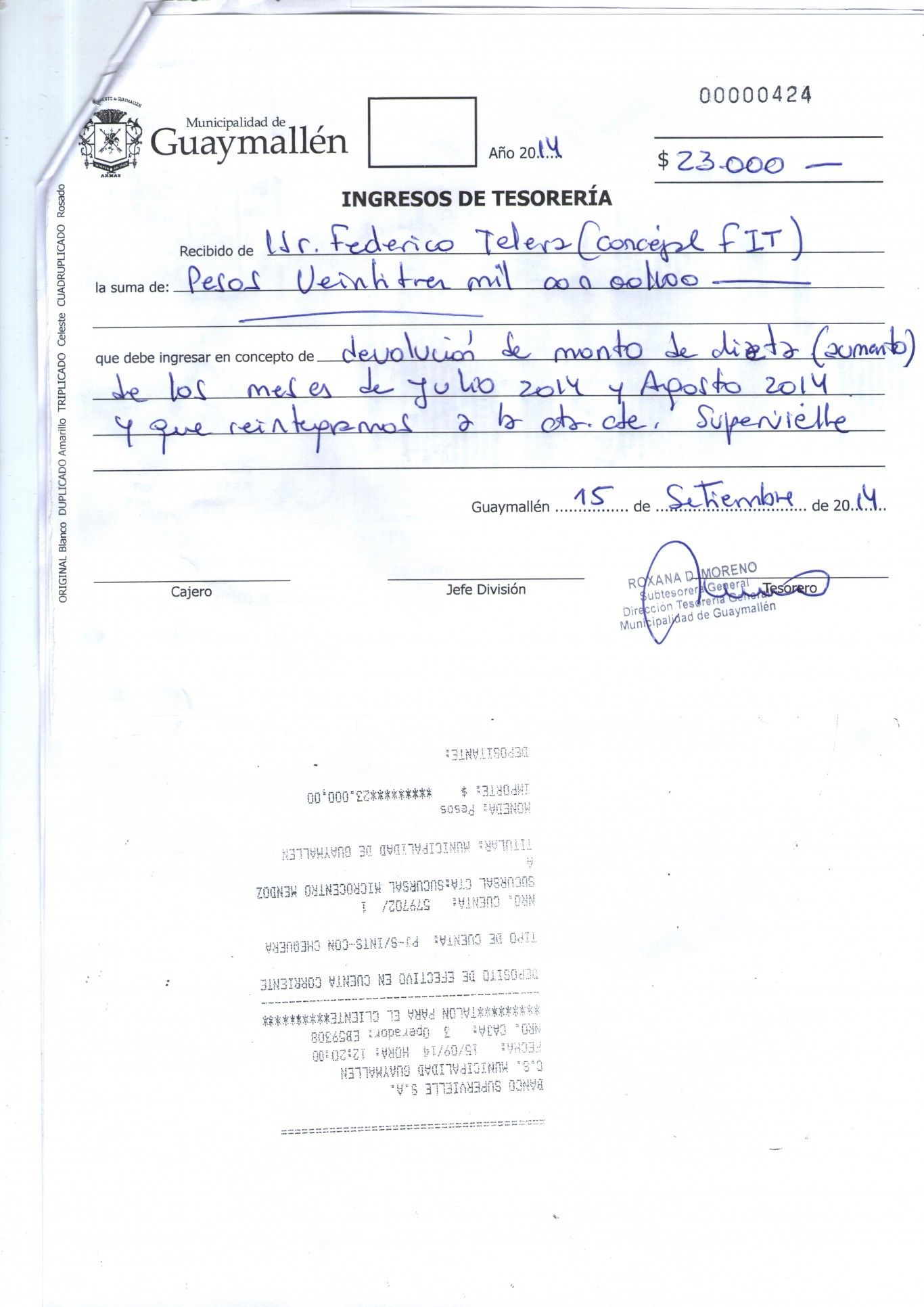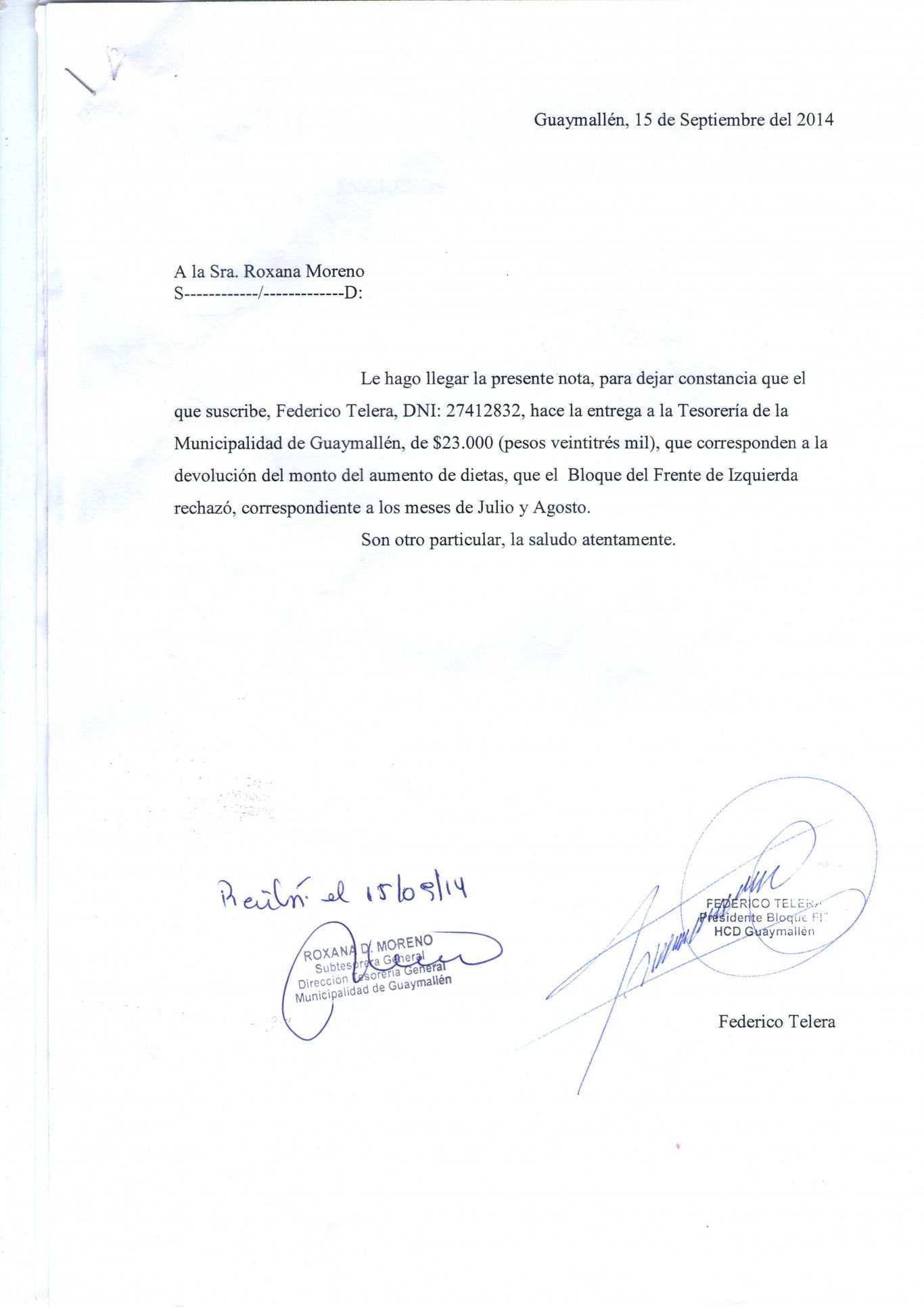"Los concejales de las diferentes fuerzas políticas adhirieron al a la resolución de presidencia antes mencionada, por la cual se deja sin efecto del aumento de dieta. No puede decirse lo mismo de Federico Telera, concejal del Frente de Izquierda y de los Trabajadores, puesto que al no renunciar formalmente continuó percibiendo el incremento", argumenta Lucero, por lo que el edil adjuntó el recibo en el que trabajadores del municipio certifican que el dinero fue devuelto.