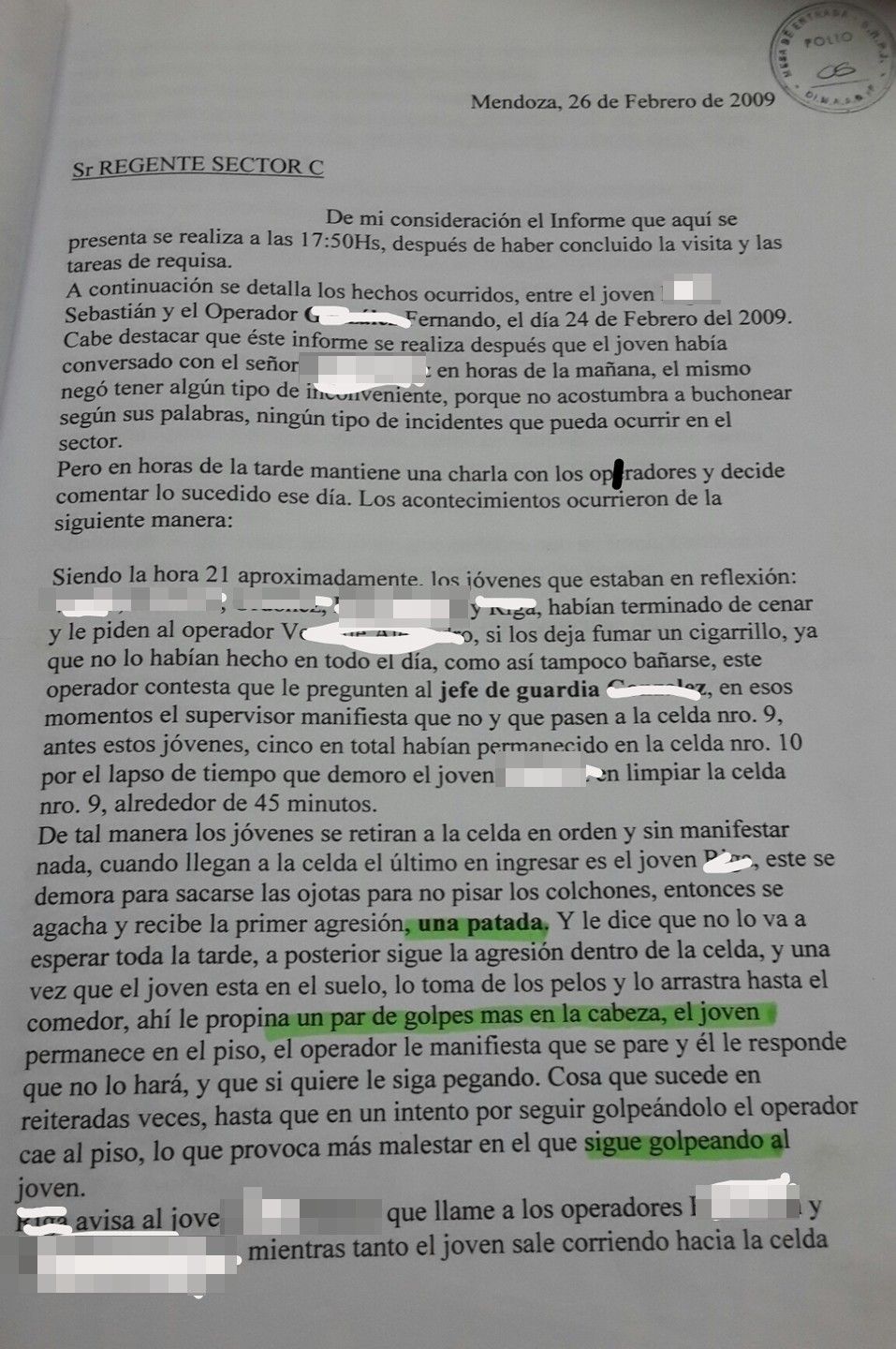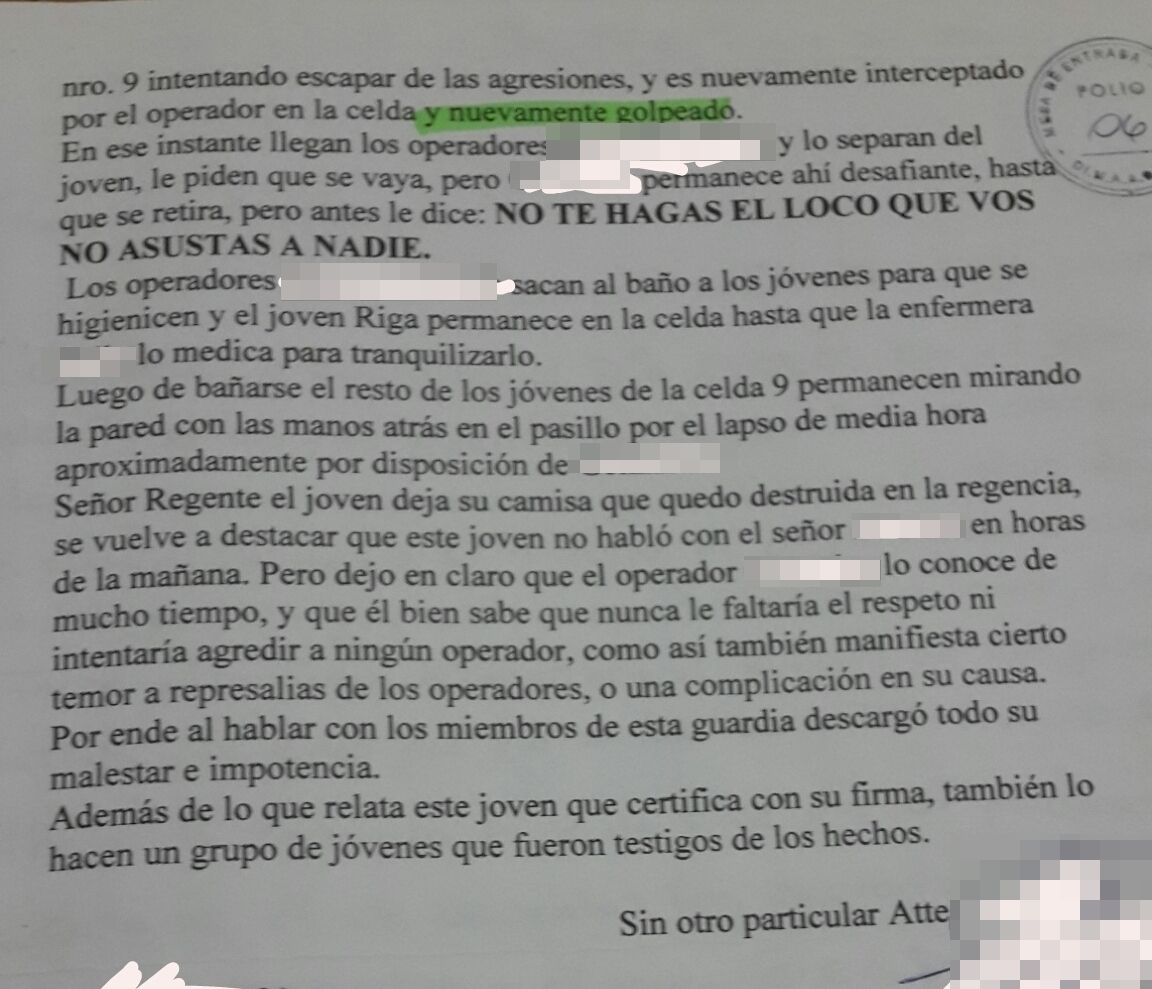 En el documento se explica que los menores le pidieron a González permiso para fumar y luego asearse este les dijo que no y les pidió que volvieran a su celda, como los jóvenes se negaron, el hombre habría golpeado a uno de ellos. Por lo que se pone a consideración del Regente del Sector C, para que González fuera sancionado, en caso de que este así lo determinara.