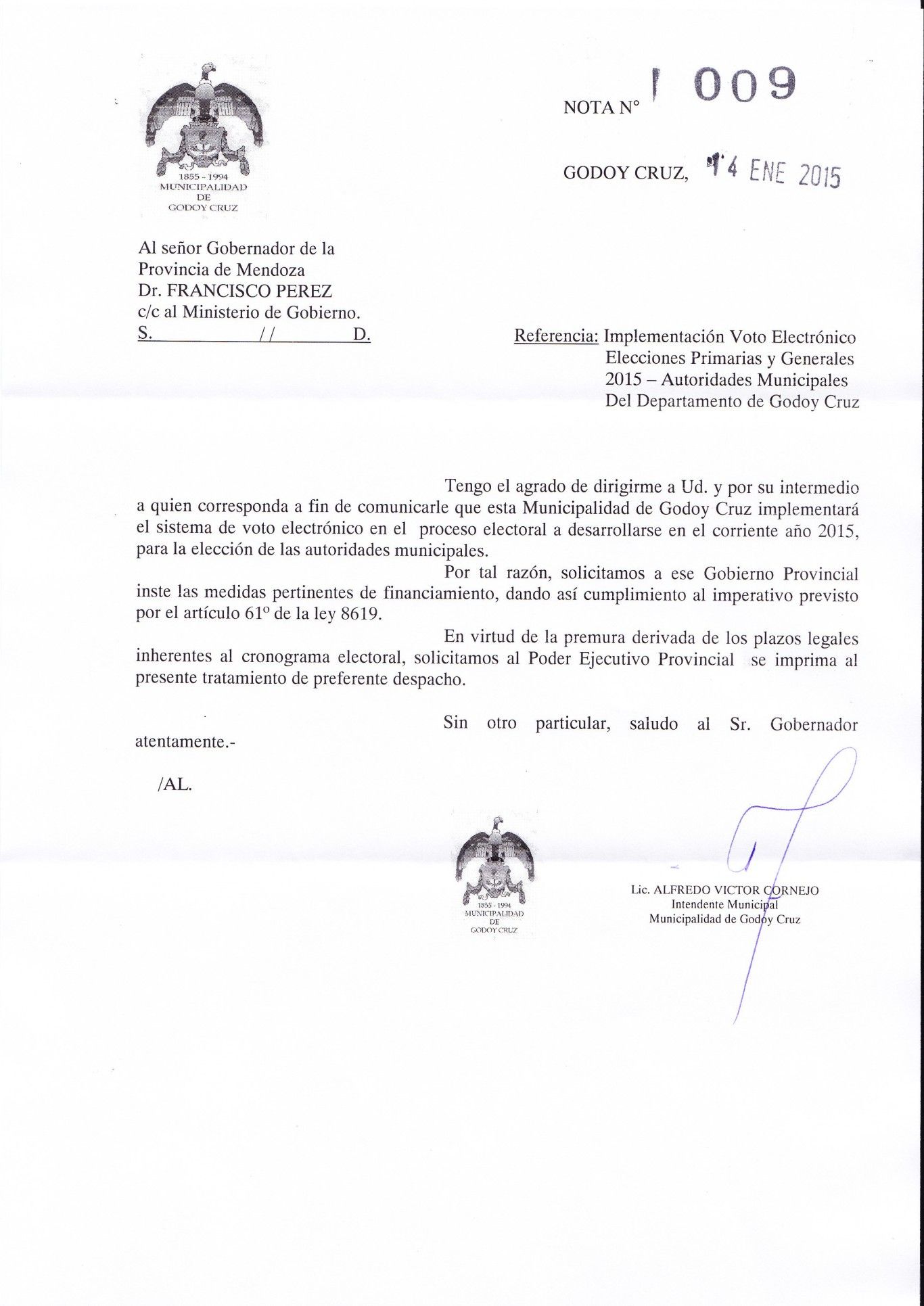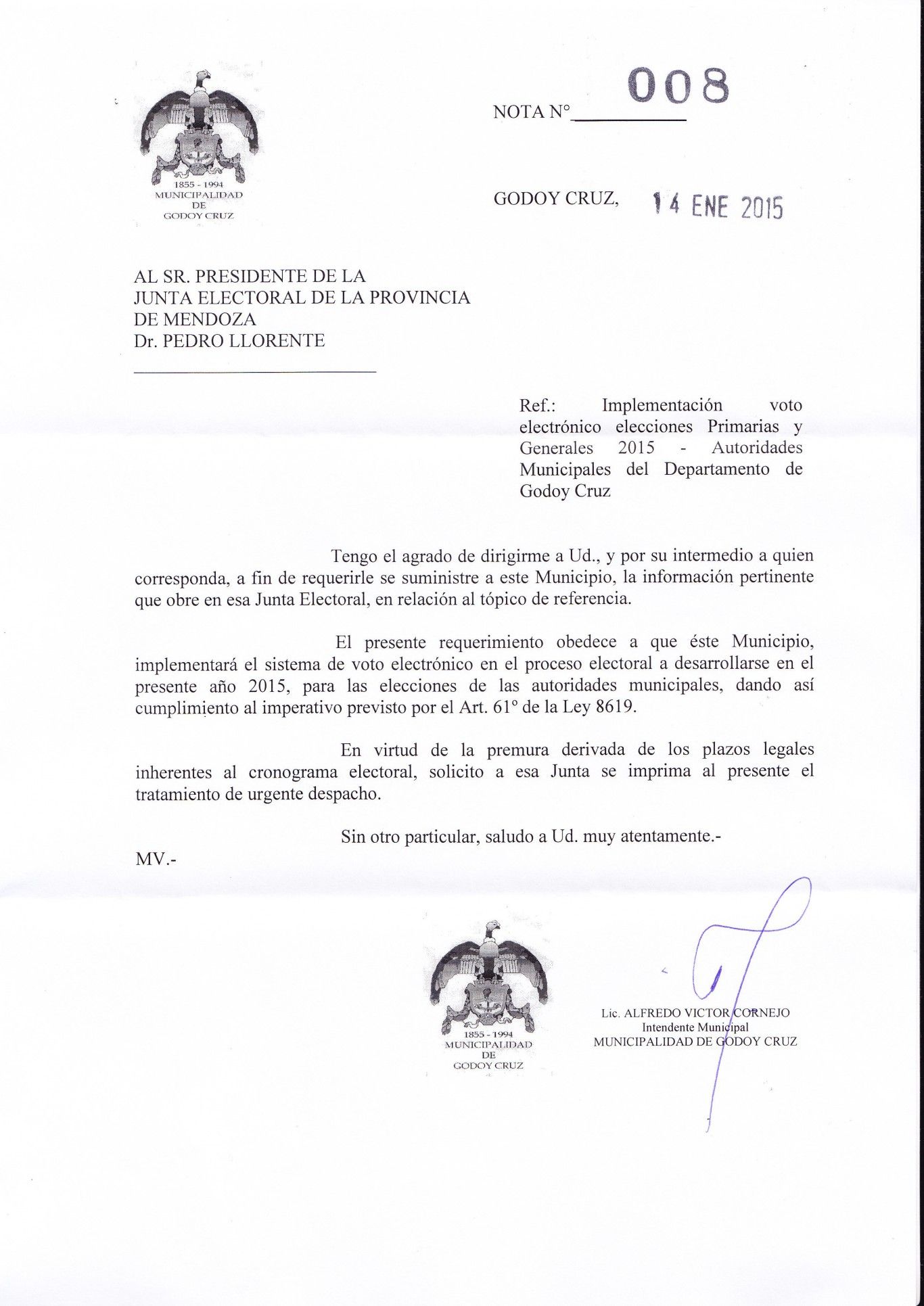 En una ráfaga de misivas, Cornejo escribió a Francisco Pérez y al ministro de Gobierno, Rodolfo Lafalla, para solicitarles fondos para la campaña de las PASO y el sufragio digital, y al presidente de la Junta Electoral y titular de la Corte, Pedro Llorente, para que le envíe los detalles del innovador sistema de elección.
