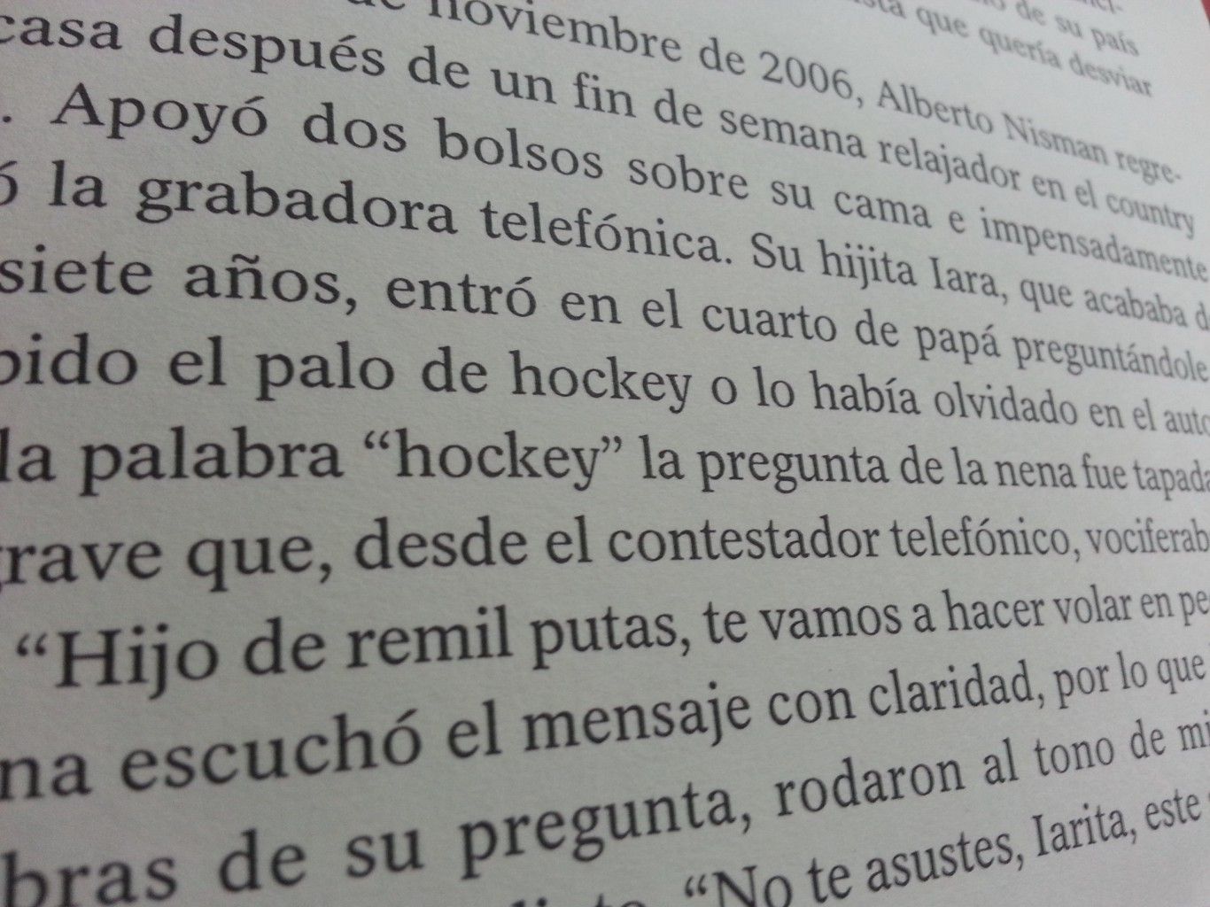 "Alberto Nisman regresó a su casa después d eun fin de semana relajador en el country Mayling. Apoyó dos boldos sobre su cama e impensadamente encendió la grabadora telefónica. Su hijita Iara, que acababa de cumplir siete años, entró en el cuarto de papá preguntándole si había subido el palo de hockey o lo había olvidado en el auto. A partir de la palabra 'hockey' la pregunta de la nena fue tapada por una voz grave que, desde el contestador telefónico, vociferaba nítidamente: 'Hijo de remil putas, te vamos a hacer volar en pedazos'".