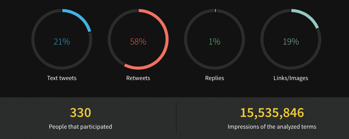 Participaron hasta el momento más de 300 personas de todos los rincones de la provincia de Mendoza. Del 100% de los tuits emitidos en el hashtag oficial, estos fueron los porcentajes representados según su clase: