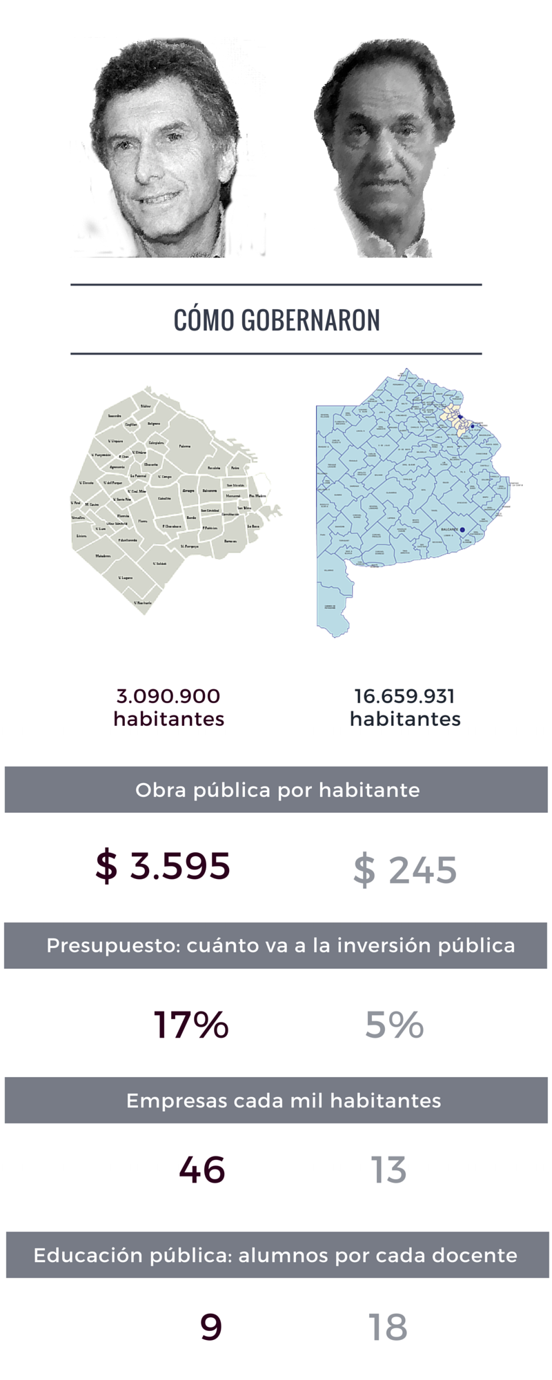 Esta nota presenta datos seleccionados de lo que Macri y Scioli hicieron en sus juridicciones, de lo que proponen hacer (según sus respectivas web) y datos de con qué Argentina se encontrarán. Si bien, como todo informe de este tipo, siempre resultará incompleto (por la amplitud de la realidad), lo importante también es generar con los comentarios una buena discusión que sirva para completar lo que falta y también para profundizar el debate de la Argentina que se elegirá el próximo domingo.