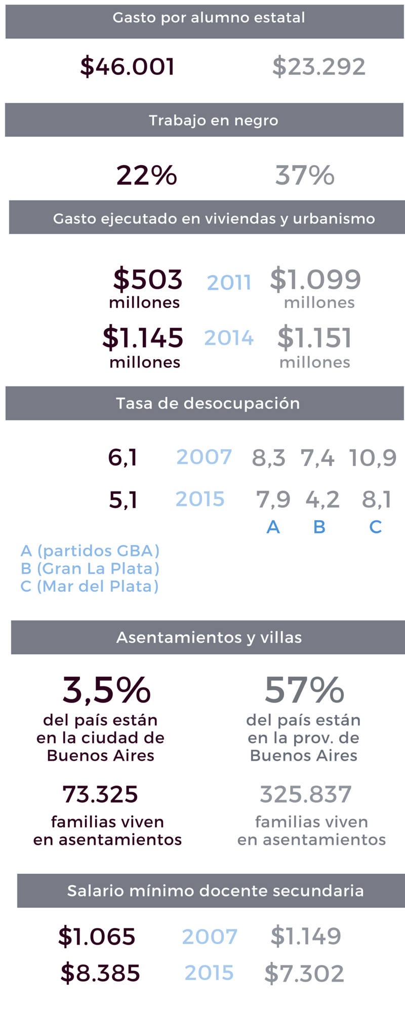 Fuentes: mauriciomacri.com.ar, danielscioli.com.ar, noamics.com, techo.org, indec.gov.ar, estadisticaciudad.gob.ar, La Nación Data y ec.gba.gov.ar.