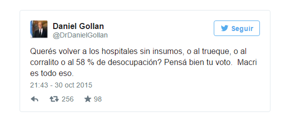 El ministro de Salud de la Nación, Daniel Gollán, desmintió esta mañana haber escrito en su cuenta de Twitter en la que se identifica como "militante político", haber escrito una horrorosa amenaza electoral. Desde ella salió un mensaje que pronosticó: "Los 12 nuevos centros de radioterapia para tratamiento del cáncer continuarán adelante si Scioli es presidente. Pensá bien tu voto".