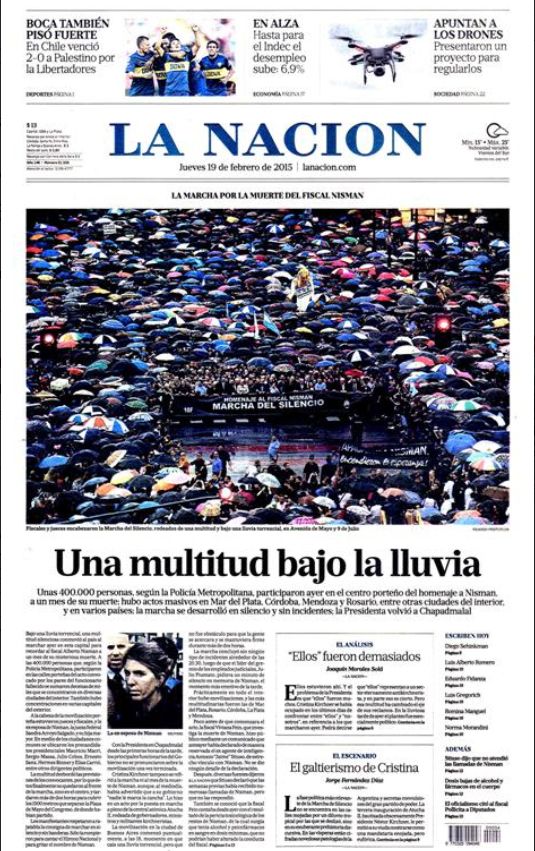 Basta mirar las tapas de ambos diarios del día 19 de febrero y sus documentos fotográficos para que la cifra mencionada de ¡400.000 personas!, resulte patéticamente absurda y políticamente armada.