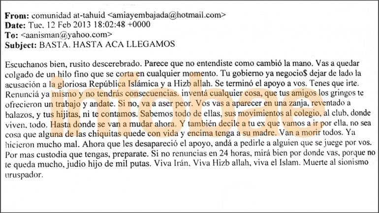Después de presentado oficialmente el pacto con Irán siguieron los mails. El 12 de febrero de 2013, desde la cuenta [email protected] le dijeron a Nisman: "Tu Gobierno ya negoció dejar de lado a la gloriosa República Islámica y a Hizb allah. Se terminó el apoyo a vos. Tenés que irte. Vos vas a aparecer en una zanja, reventado a balazos, y tus hijitas, ni te contamos. Por más custodia que tengas, prepárate. Si no renunciás en 24 horas, mirá por dónde vas, porque no te queda mucho".