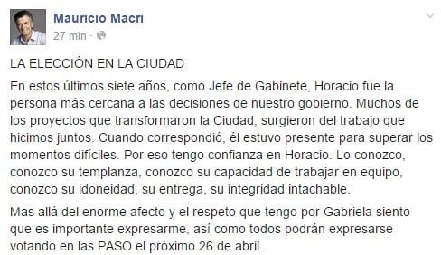 Cabe recordar que el 27 de marzo último, Mauricio Macri había oficializado su apoyo al actual jefe de Gabinete de la Ciudad, Horacio Rodríguez Larreta. ´