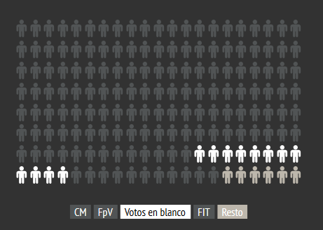 La diferencia entre el FpV (47.52 %) y CM (39.18 %) fue 8,34%, ante un escenario de 6,43% de votos en blanco y 1,83% de votos nulos. Entre ambos, 8,26%