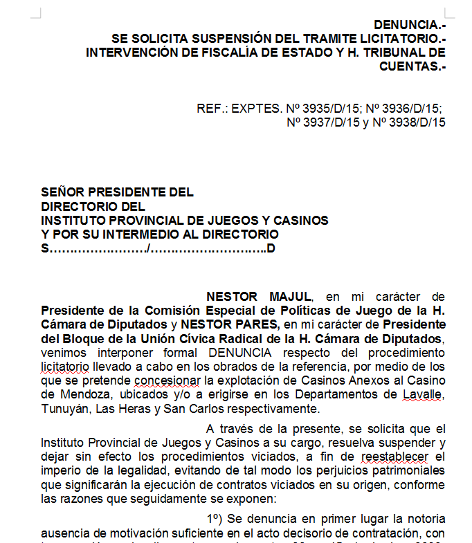 Los radicales de Cornejo subrayaron en la presentación que presentaron por duplicado tanto en el Casino como en la Fiscalía de Estado, que, además de todo lo planteado con anterioridad, "la convocatoria no cumple con un requisito fundamental, exigido por el art. 68 inc. 2º del Decreto Nº 450/2015, cual es el que está relacionado con la determinación clara y concreta del servicio objeto del contrato. En efecto, el aviso publicado en la web oficial lisa y llanamente omite indicar cuál es este servicio que se pretende contratar; a su tiempo, el aviso publicado en el Boletín Oficial de la Provincia sólo dice ´Pliego Licitatorio de Condiciones Especiales y Técnicas para Anexo Casino Departamental de …´.