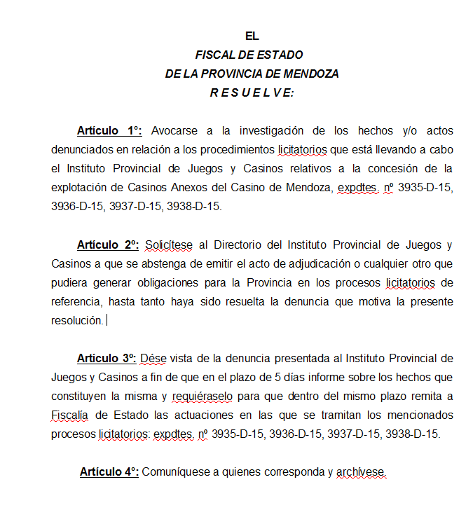 La Fiscalía, entonces, decidió que el Casino no haga nada con el proceso licitatorio, salvo no adjudicar, "hasta que haya sido resuelta la denuncia". En tanto, le pidió a las autoridades del IPJC que "en un plazo de 5 días informe sobre los hechos" denunciados en su presentación por los referentes legislativos de la UCR.