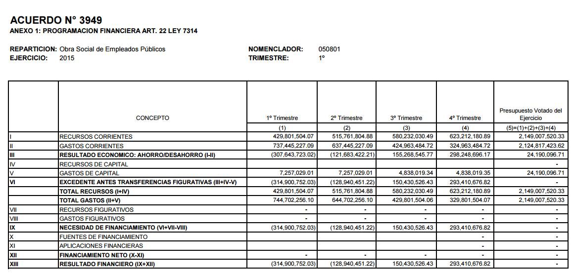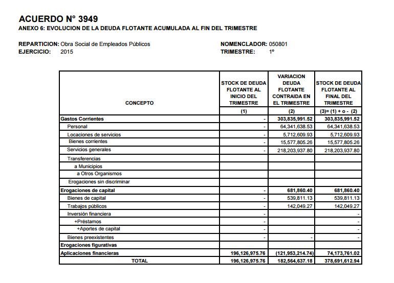 Durante el primer trimestre de 2015, se gastaron 429.801.504 millones, superando en más de 11 millones la proyección, y el organismo publicó que tiene una deuda flotante de 377 millones de pesos, en la que no se incluyen los pagos que se adeudan a las clínicas privadas, por tratarse de una deuda contraída en el segundo trimestre.