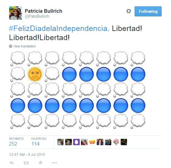 Es que, minutos después de las 12, la ex ministra de Trabajo escribió “#FelizDíadelaIndependencia. Libertad! Libertad! Libertad!”. Y junto con la frase, agregó una serie de emoticones, con la intención de formar una bandera.