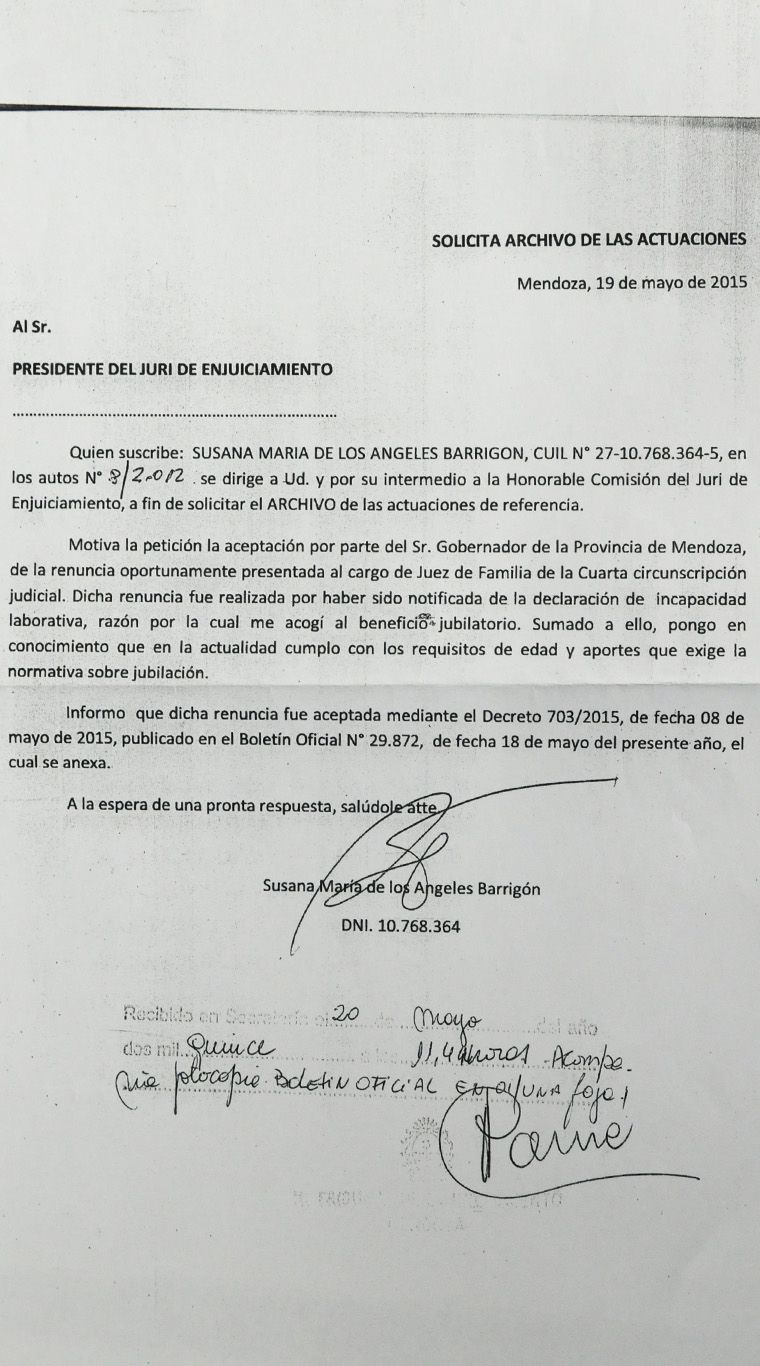 En medio de este proceso, Barrigón presentó su renuncia al cargo argumentando incapacidad laboral y acogiéndose al beneficio jubilatorio. Atento a esto, el gobernador, quien tiene la facultad de aceptar o no la dimisión de todo funcionario público, dio cabida a la solicitud de la magistrada, según consta en el boletín oficial del 18 de mayo de este año, bajo el decreto nº 703 (ver extracto aquí).