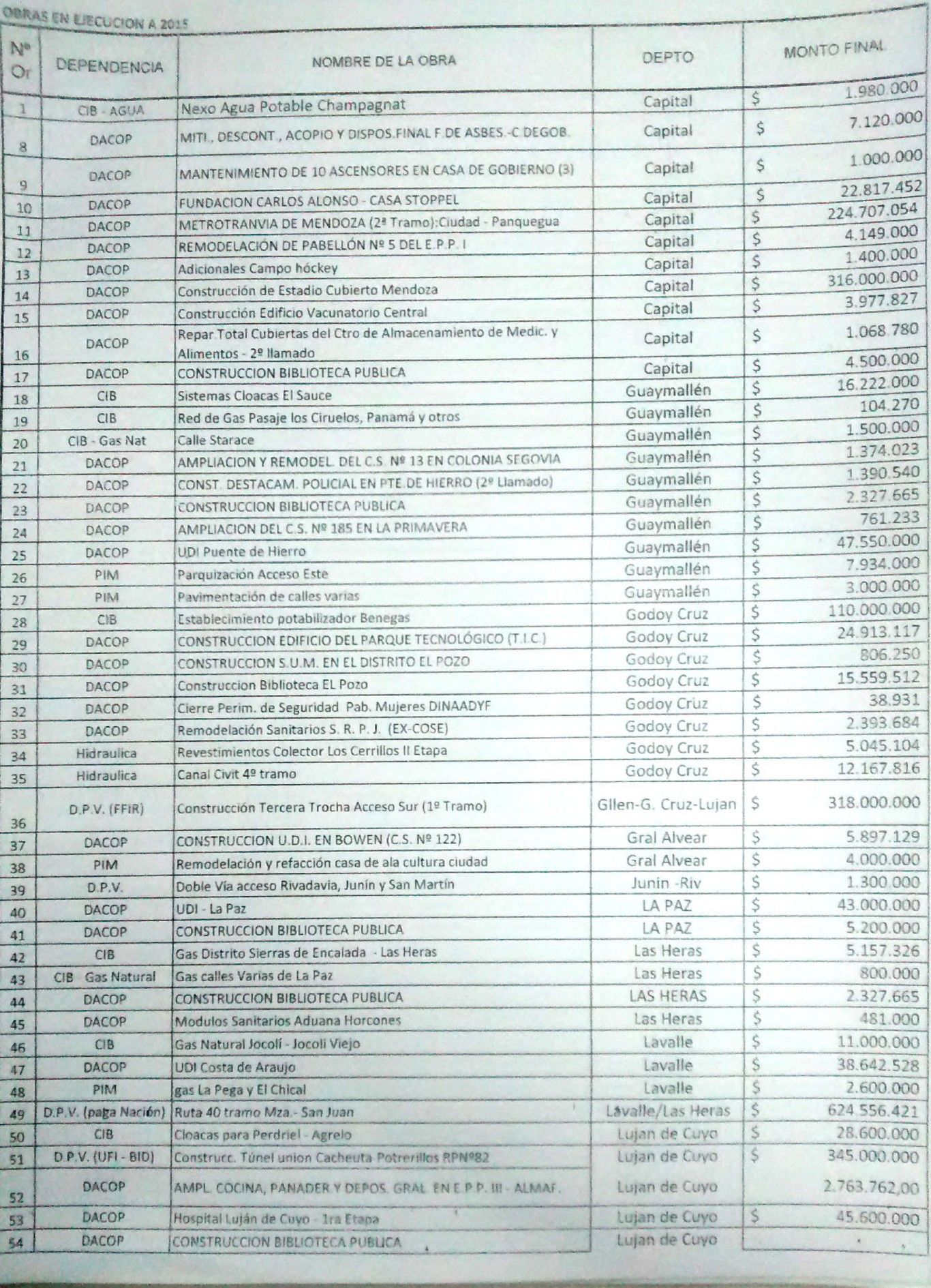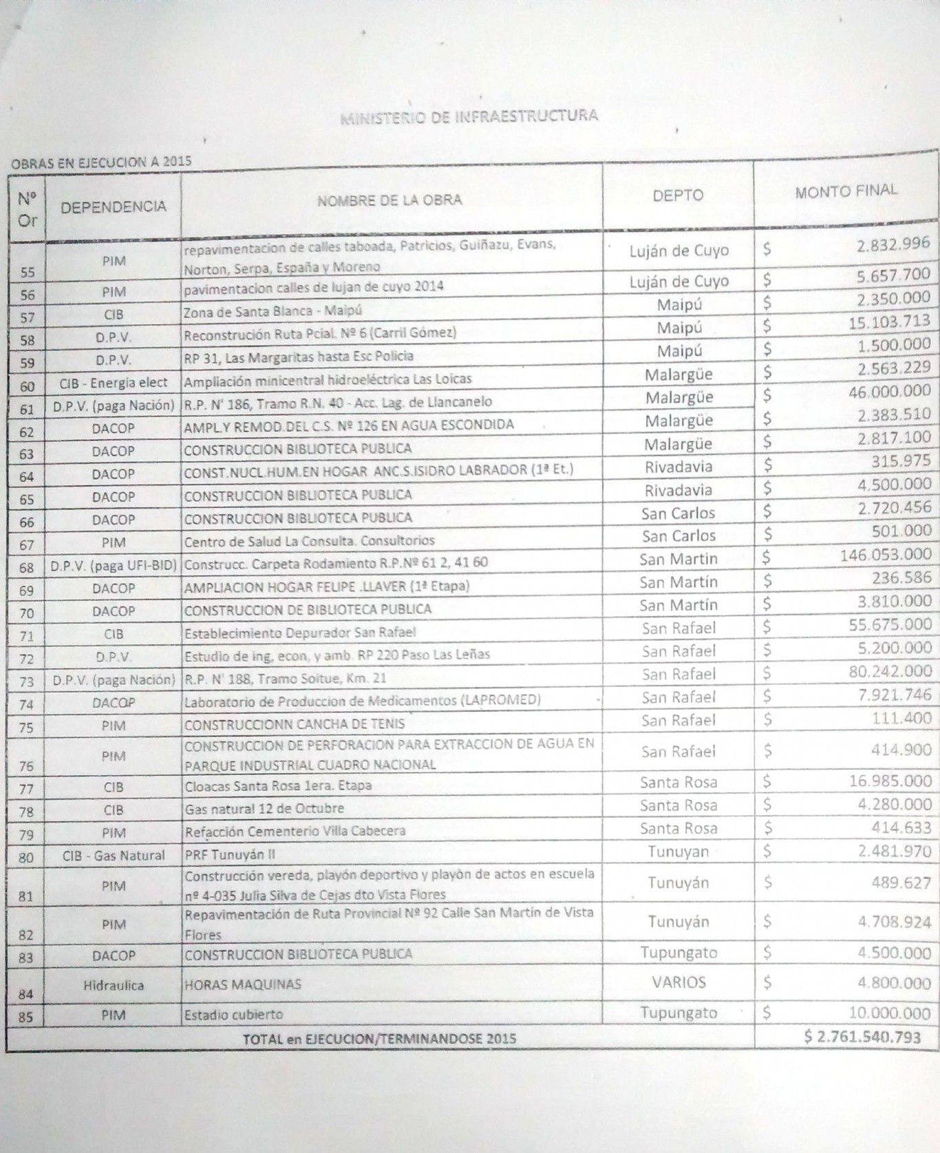 "Hacemos reparación permanente, e invertimos en edificios escolares más plata ($33.144.270 en 2015 -ejecutado-) que en la Villa Olímpica ($10.674.307), y más plata ponemos en los hospitales -el hospital de Malargüe, el hospital de Las Heras, la UDI en Fray Luis Beltrán- en todos lados tenemos una cantidad sobreabundante de obras para mostrar y comprobar que las hemos hecho", comentó el ministro.
