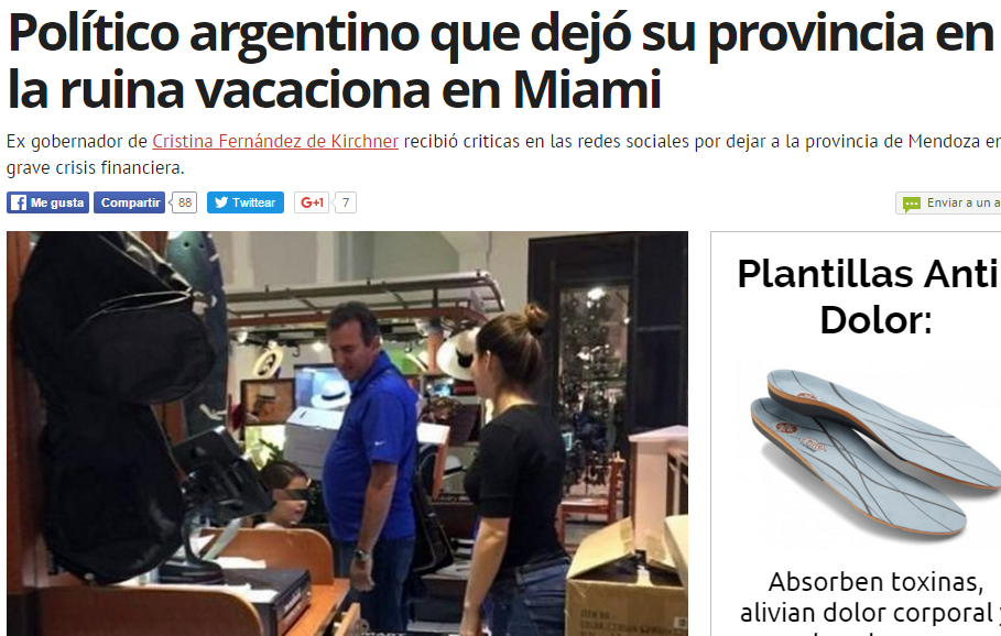 El diario La República, de Perú, explicó a sus lectores que "una fotografía del ex gobernador, Francisco 'Paco' Pérez, quién disfruta de sus vacaciones en el Aventura Mall de Miami generó indignación de diversos usuarios enTwitter. Pérez dejó la provincia de Mendoza, Argentina, sumida a una grave crisis financiera".