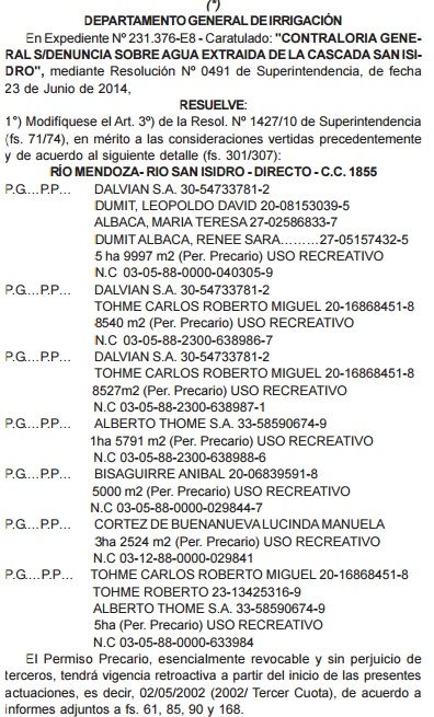 Como explicó MDZ, Irrigación había ratificado en 2014 que el San Isidro es un curso de agua público y para otorgó permisos precarios a los titulares de las tierras que están en los alrededores. Ese permiso es para "uso recreativo". Los usuarios debían pagar el canon por creación de cauce y también mensualmente por el uso del agua. Allí Dalvian recurrió a la Corte denunciando que no había tenido derecho de defensa en Irrigación y asegurando que el curso de agua era de su propiedad. Si la empresa ratifica el anuncio realizado en Irrigación, quedarán firmes las resoluciones que disponen "el Permiso Precario, esencialmente revocable y sin perjuicio de terceros" para Vila y otros usuarios. Si eso ocurre, deberán presentar " cartografía consignando sistema de riego y demarcación de la superficie cultivada o parquizada".