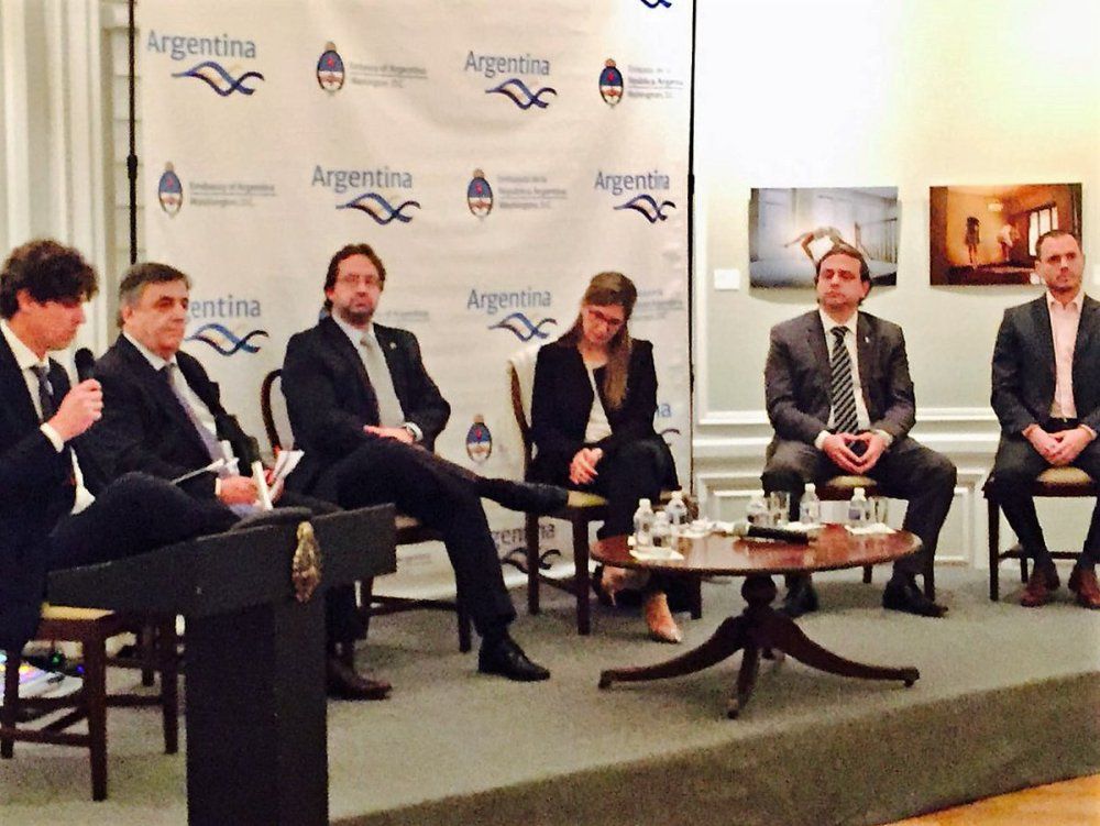 El enojado Martín Lousteau, Mario Negri, Marco Lavagna, Graciela Camaño, Guillermo Snopek y Fernando Sánchez el jueves en la mesa redonda en la embajada argentina en Washington
