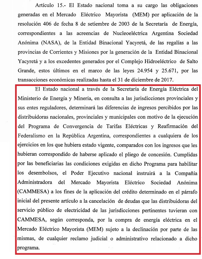 En la asamblea de accionistas se comprometieron a buscar una solución a la crisis. El foco estaba puesto en la deuda con Cammesa. Es que la empresa del grupo Vila - Manzano dejó de pagar por la electricidad que le vendían y se acumuló un pasivo enorme. La excusa fue el atraso tarifario y en particular el "Plan de Convergencia" que implementó el gobierno anterior y que obligaba a congelar las tarifas. Pues ahora desde la Nación le dieron "la razón". El artículo 15 del Presupuesto busca compensar a las empresas eléctricas por los "ingresos no percibidos" por ese congelamiento de tarifas. Si el Presupuesto se aprueba así, las empresas deben sacar cuentas para verificar ese monto y serán resarcidas. El mecanismo para "pagarles" es achicar la deuda que tienen con Cammesa, pudiendo llegar a la condonación total.
