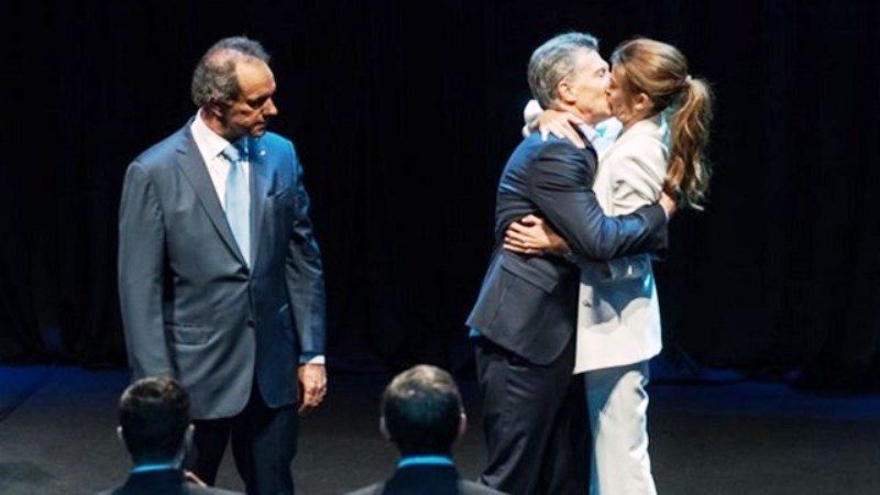 El gesto, al que cuesta creer que fue planificado por estrategas y marketineros, sucedió al final de esta reunión. No había palabras ya, sino gestos. Macri se confundió en un abrazo con su esposa, mientras Scioli parecía De la Rúa en lo de Tinelli. El candidato del entonces oficialismo contaba con la compañía de su mujer, Karina Rabolini.