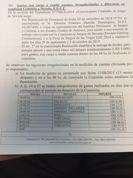 Allí se expresa que Domínguez viajó en 2014 a una "reunión de trabajo" de la Comisión de Juegos de Nevada y la feria de Juegos de Las Vegas en representación del Instituto de Juegos y Casinos.