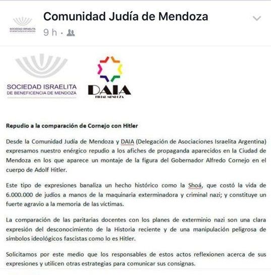 La Comunidad Judía de Mendoza salió al cruce de las manifestaciones del SUTE por el fotomontaje en el que se utiliza una imagen de Adolfo Hitler con el rostro de Alfredo Cornejo.