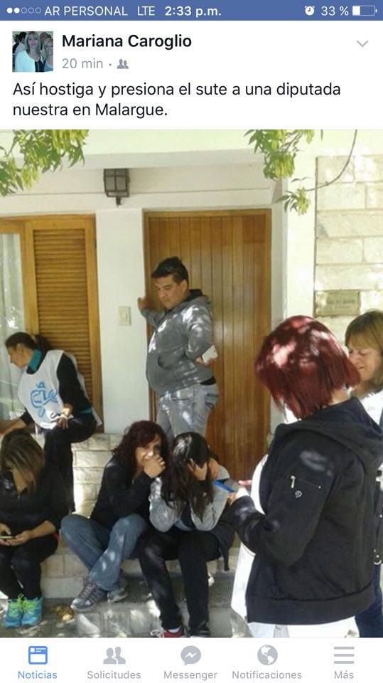 Quien retrató en su Facebook lo que ocurría en la casa de la diputada malargüina fue la senadora radical Mariana Caroglio, quien ya votó a favor del decreto del aumento, con el ítem Aula incluido, dispuesto por el gobierno provincial. Y se expresó con otro tono: además de presión por parte del SUTE, denunció escraches, hostigamiento y hasta amenazas.
