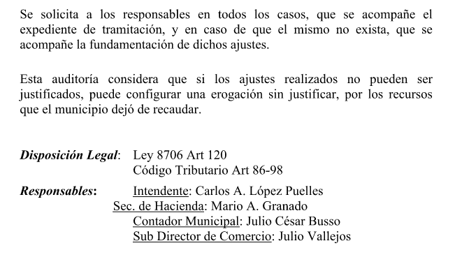 La cuestión es que el exsecretario de Hacienda auditará sus propias gestiones, porque -por ejemplo- el ejercicio 2014 todavía no tiene fallo y en los próximos días se publicará en el Boletín Oficial el fallo 16555, el cual consideraría -según las fuentes- una multa para los responsables de irregularidades por el ejercicio 2011, las cuales seguirían siendo las mismas que se encontraron en la gestión de Granado. Así gráfica el mismo Tribunal de Cuentas la responsabilidad de los funcionarios.