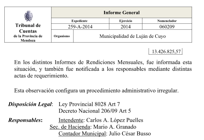Mario Granado fue secretario de Hacienda de López Puelles y también fue funcionario del Gobierno provincial bajo la administración de Celso Jaque, donde ocupó el cargo de subsecretario de Hacienda acompañando al ministro Adrián Cerroni, el que curiosamente también terminó en el Tribunal tras su salida del Ejecutivo. Uno de los informes donde se menciona a Granado.