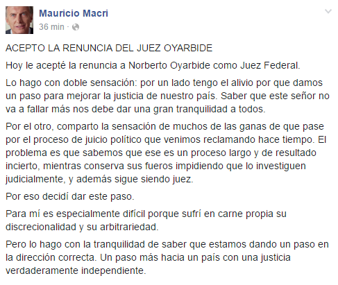 Esta noche el presidente Mauricio Macri le aceptó la renuncia al juez Norberto Oyarbide. Macri anunció la decisión a través de las redes sociales y justificó su decisión señalan que es "un paso en la dirección correcta".
