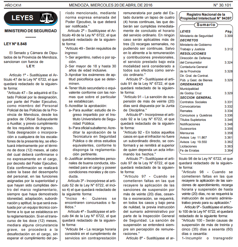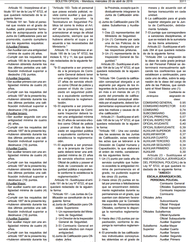 Fue publicado en el Boletín Oficial el decreto 318 que establece modificaciones a la Ley Provincial de Policías. En ese sentido, mediante cambios que se introdujeron en la ley y otras normas que se impulsan en la Legislatura, se busca generar herramientas para premiar con ascensos a los efectivos que se destaquen en su labor. El gobernador Alfredo Cornejo dijo, al dar inicio a las clases en el Instituto Universitario de Seguridad (Iusp) que se hacen más estrictos los requisitos para convertirse en miembro de la fuerza e impone mayor rigurosidad en la disciplina de los agentes.