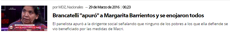 En una extensa charla, Barrientos apeló a su "educación con tercer grado de escuela" para cuestionar a Brancatelli, con quien tuvo un cruce en el talk show político "Intratables". "Me gustaría tener más estudios para tener la lengua más rápida, pero tengo lo que tengo", dijo, para luego evitar criticar al hombre que la criticó amargamente en televisión.
