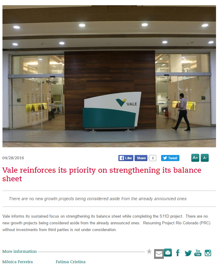 Por eso al escuchar las declaraciones de Guiñazú los entendidos en materia minera fueron en busca de una prueba concreta del "compromiso" de Vale para reactivar el yacimiento en Malargüe. Con ese objetivo la búsqueda apuntó a la Toronto Stock Exchange, TSE, (Bolsa de Toronto) donde las empresas que cotizan en ese mercado canadiense (como Vale) están obligadas a anunciar a sus accionistas a través de un press release si el directorio toma alguna decisión que pueda afectar el valor de las acciones.