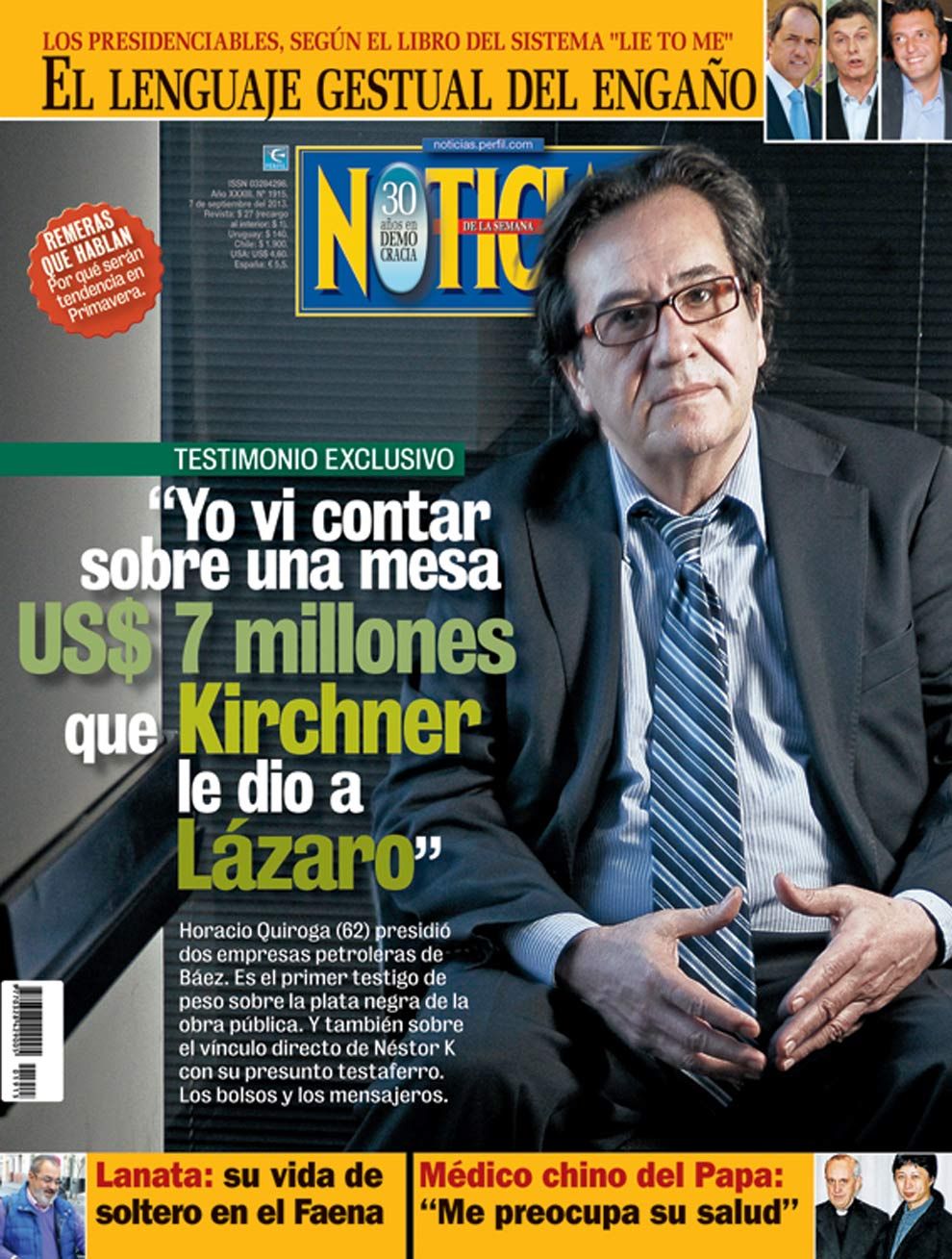 Quiroga fue citado por el juez Casanello por sus dichos a la revista "Noticias", en los que afirmó que Kirchner envió a esas empresas siete millones de dólares en efectivo. Quiroga, durante la entrevista con Noticias.