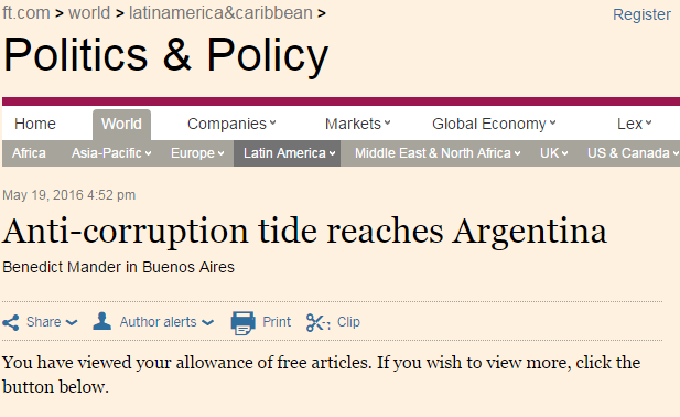 El medio británico Financial Times difundió un artículo que fue titulado "La ola anticorrupción también llegó a la Argentina". Firmado por Benedict Mander, el FT enmarca la situación judicial en nuestro país con el contexto latinoamericano que afecta a Dilma Rousseff y cita a Carrió entre sus entrevistados.