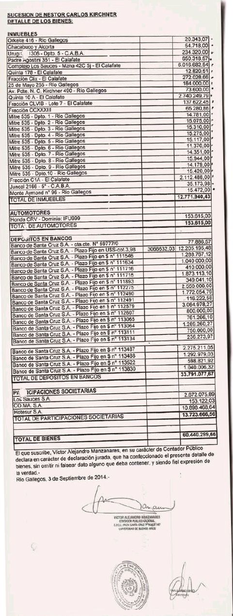 Expesa que el documento que entregó el 3 de septiembre del 2014 en el juzgado de primera instancia en lo civil y comercial y de minería de Río Gallegos. En ese juzgado sigue abierto el trámite por la sucesión de Néstor Kirchner. El administrador de los bienes de su padre fallecido es su hijo mayor, Máximo.