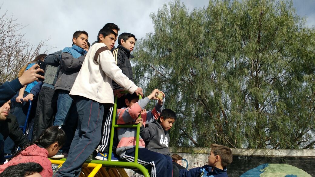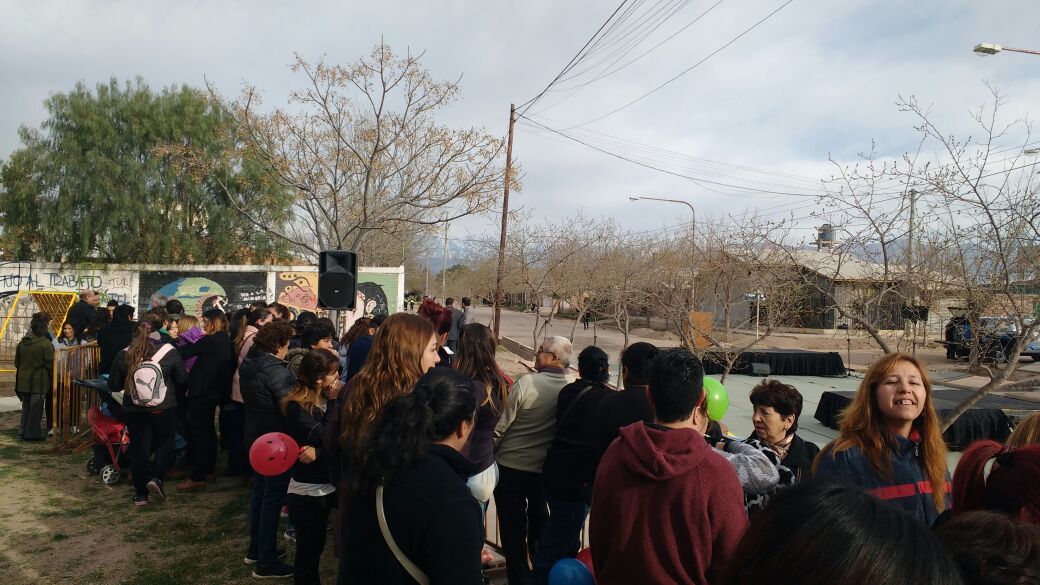 Un grupo de vecinos convocados a través de una tarjeta, alumnos de la escuela de punta en blanco, algún globo suelto con carita feliz dibujada. No hay movilización de militantes, tampoco mucha euforia, pero sí orgullo en el Barrio Coni.
