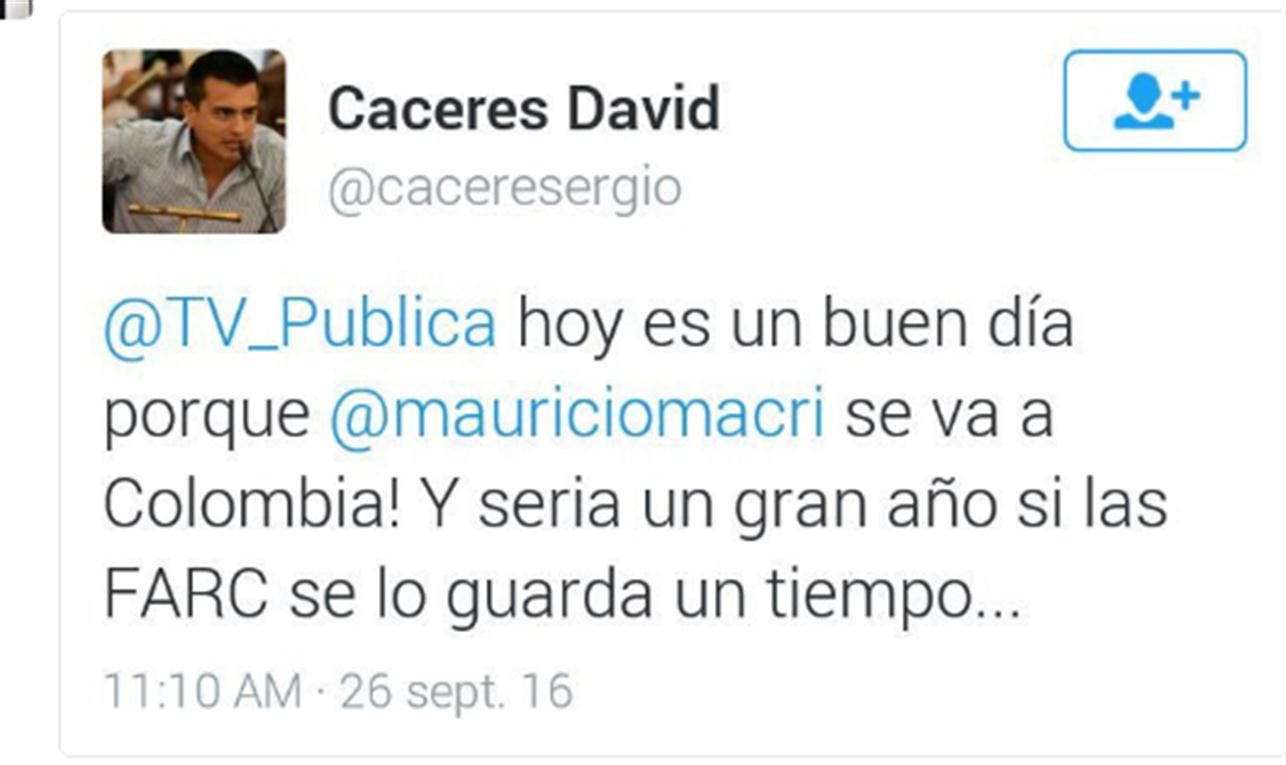 "Hoy es un buen día porque @mauriciomacri se fue a Colombia! Y sería un gran año si las FARC se lo guarda (sic) un tiempo", escribió el concejal en su cuenta @caceresergio, de la red social Twitter.