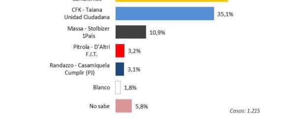 En la encuesta del estribo, la lista de Cambiemos le saca una ventaja de 5 puntos a la de Unidad Ciudadana en la puja en la categoría de senador nacional por la provincia de Buenos Aires. Según los números de Query, firma que hace la muestras que distribuye la consultora M&R Asociados del ex funcionario Gustavo Marangoni, la fórmula Bullrich-González tiene, a cuatro días de las elecciones, el 40,1% de las adhesiones por sobre Cristina-Taiana, que recoge 35,1%. El dúo Massa-Margarita se mantiene en un cómodo 10,9% mientras que Randazzo-Casamiquela se derrumba: los supera Pitrola-D'Altri, del frente de Izquierda, por una décima: 3,2% a 3,1.