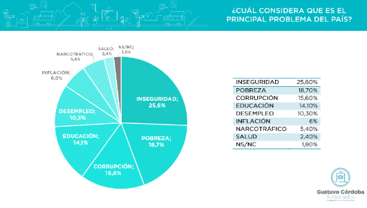Por caso, una encuesta realizada este mes por Gustavo Córdoba & Asociados concluye que, para los consultados, el principal problema del país es la inseguridad, seguido por la pobreza. Mientras que la desocupación ocupa el quinto lugar y la inflación, que supo estar a la cabeza durante meses, aparece recién en un sexto y lejano lugar. Llamativamente, no figura un rubro tan sensible y cuestionado como el de la Justicia.