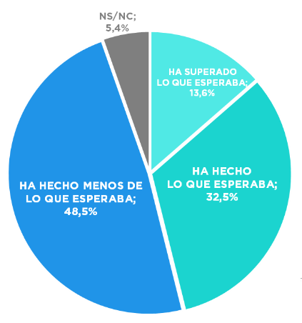 Si la mira apunta a la gestión de Mauricio Macri y se pregunta cómo se lo evalúa de acuerdo con lo hecho hasta ahora, gana por buen margen (48,5%) el "hizo menos de lo que esperaba". El "ha superado lo que esperaba" alcanza un magro 13,6%.
