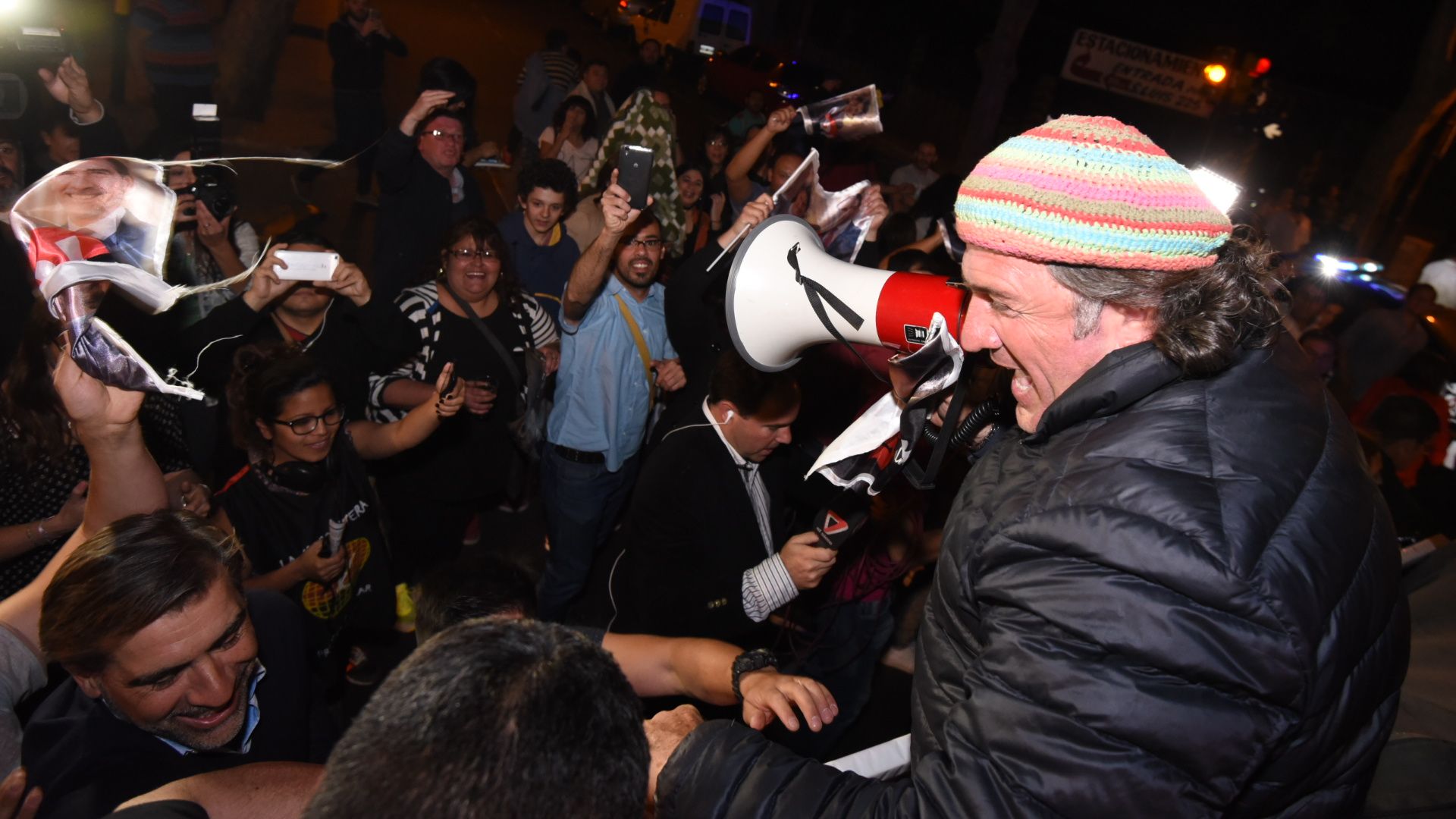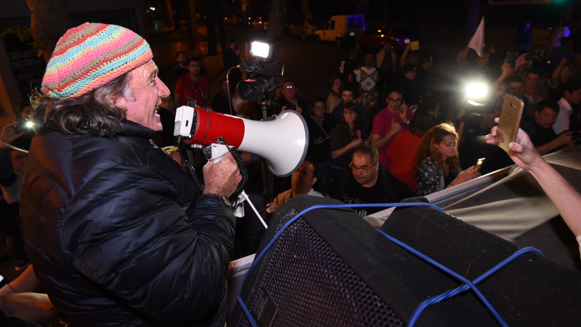 Allí, ante los militantes que previamente habían sido increpados en la calle por jóvenes radicales, dijo: "La frazada es el símbolo de la lucha ciudadana. Tienen un diputado que va a pelear por el bolsillo de los mendocinos".