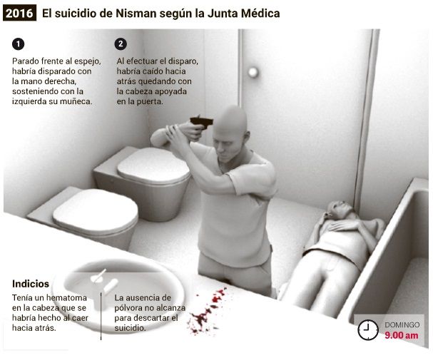 "Uno manipula el arma y otro asiste y manipula el cuerpo de la víctima. El victimario 2 junto al cuerpo con vida de la víctima lo posiciona con la pierna derecha apoyada en el piso y la izquierda flexionada, rodilla a tierra con el torso erguido ubicado frente a la bañera próximo con su hombro derecho al vanitory y sobre la alfombra, al mismo tiempo, el victimario 2 se ubica en cuclillas sobre el lateral izquierdo apoyando en flanco izquierdo de Nisman, sujetando por las axilas a modo de abrazo", indica el texto.