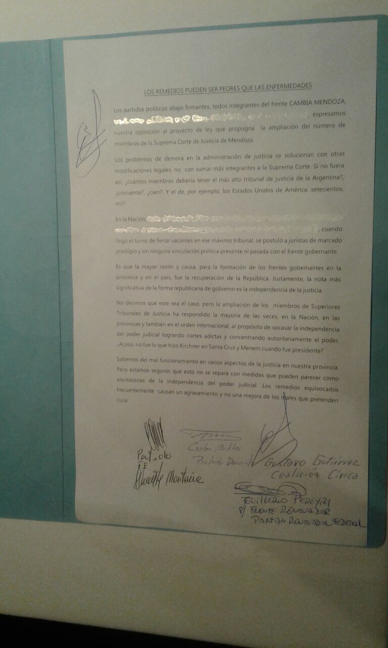 La negativa del PD se convirtió en horas de la noche en un rechazo por escrito de varios partidos que acompañan a la UCR en Cambia Mendoza. Firmaron el documento, además de Carlos Balter por los demócratas, Guillermo Pereyra (Frente Renovador), Gustavo Gutiérrez (Coalición Cívica) y Clemente Montaña (Partido Fe).