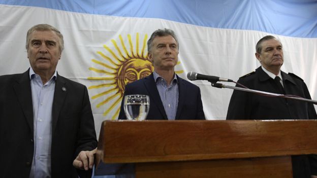 Macri (centro) ha apoyado a Oscar Raúl Aguad (izquierda), ministro de Defensa, pero medios locales han reportado su intención de remover al jefe de la Armada, el almirante Marcelo Srur (derecha).