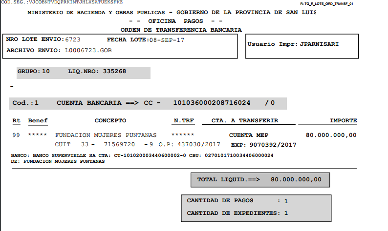 El pasado 1 de setiembre Gisela Vartalitis presentó ante el ministerio de Medio Ambiente, Campo y Producción, el proyecto denominado "Mujeres Puntanas Emprendedoras". De tan solo cuatro carillas, en el mismo día logró suscribir el convenio donde el ministerio que comanda Sergio Freixes otorgaba a la Fundación de Rodríguez Saá y su esposa, la suma de $80 millones. (Click aquí para ver el proyecto presentado) El 8 de setiembre, a solo 5 días hábiles de haber sido solicitado el subsidio, el Decreto N° 5762 MMACyP-2017 que establecía el pago, ya había sido firmado, ese mismo día se libró la orden de pago y se efectuó la transferencia a la Cuenta Corriente del Banco Supervielle N°101036000208716024. En solo 120 horas hábiles, la ONG había recibido el dinero solicitado. (Click aquí para ver el decreto de pago).